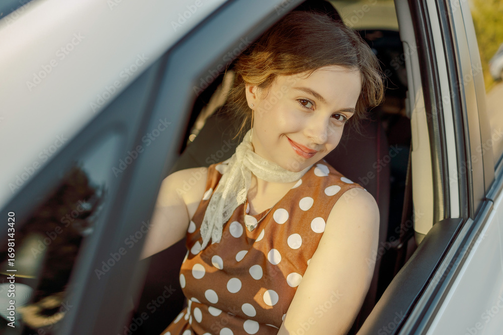 Close-up portrait of a woman in a dress, smiling brightly. She is excited about traveling, a new car purchase, or learning to drive, capturing joy and anticipation
