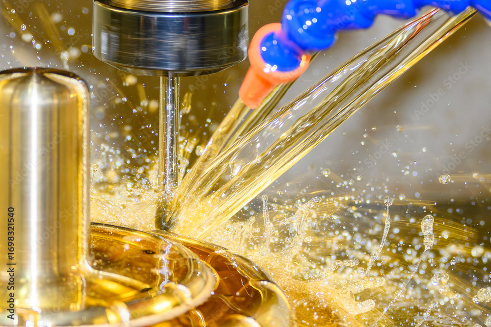 Close up scene the CNC milling machine finishing cut the brass shell mold parts with oil coolant method.