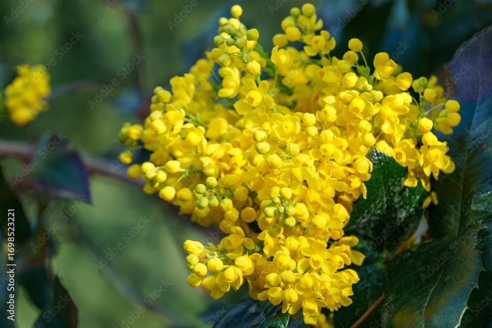 Dense cluster of light yellow flowers of Mahonia aquifolium or Oregon grape blossom in full bloom, surrounded by dark green leaves, creating vibrant contrast