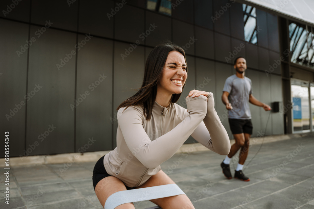 A female athlete squats with her eyes closed and her hands together while a rubber band is on her hips while a male athlete jumps rope behind her