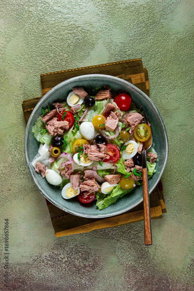 salad with canned tuna, vegetable salad with quail eggs, lettuce, red onion , cherry tomatoes , olives, keto food, healthy food, homemade, no people