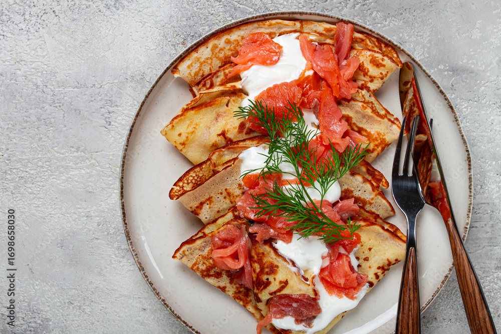 Delicious pancakes with salmon and sour cream , breakfast, on a plate, rustic style ,with cutlery
