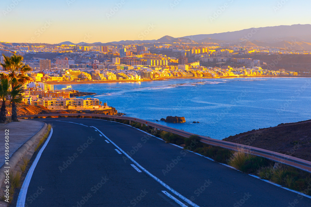 Sunset view of Las Palmas city in Gran Canaria with golden light reflecting on buildings along the coast. Winding road leads toward the Atlantic Ocean, framed by mountains in background