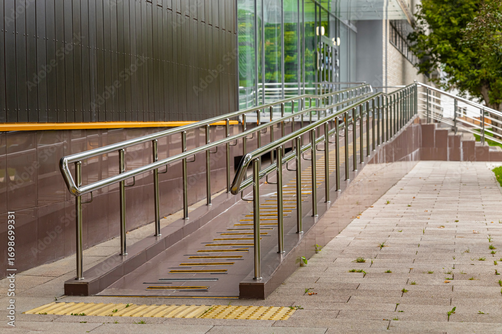 a long ramp leading up to the entrance of the building. comfortable environment for people with limited mobility.
