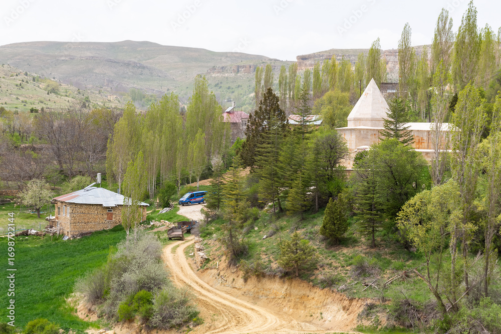 General view of the Karamanoğlu Mehmet Bey Tomb and village houses. Balkusan, Ermenek, Karaman - May 17, 2025.