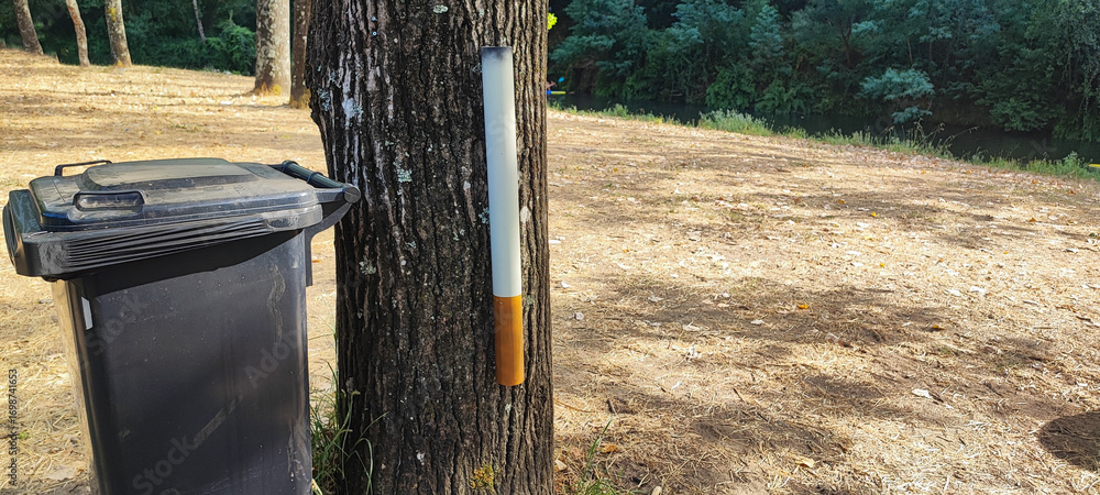 Large cigarette-shaped installation on a tree beside a park trash bin. public art and litter awareness about smoking and pollution