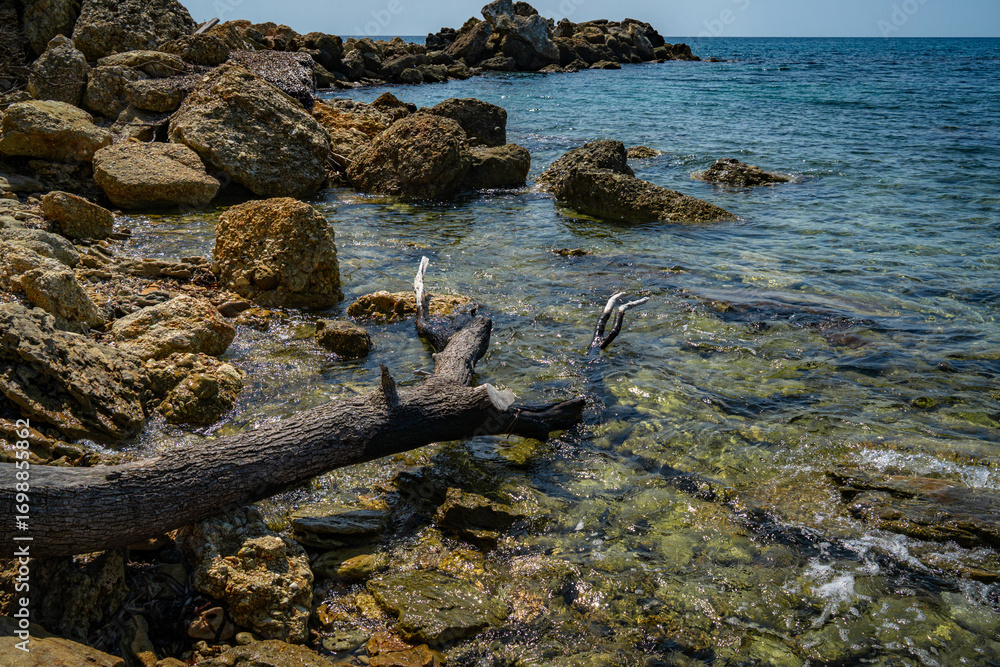 Rocky coast of the Mediterranean Sea on the island of Corfu.