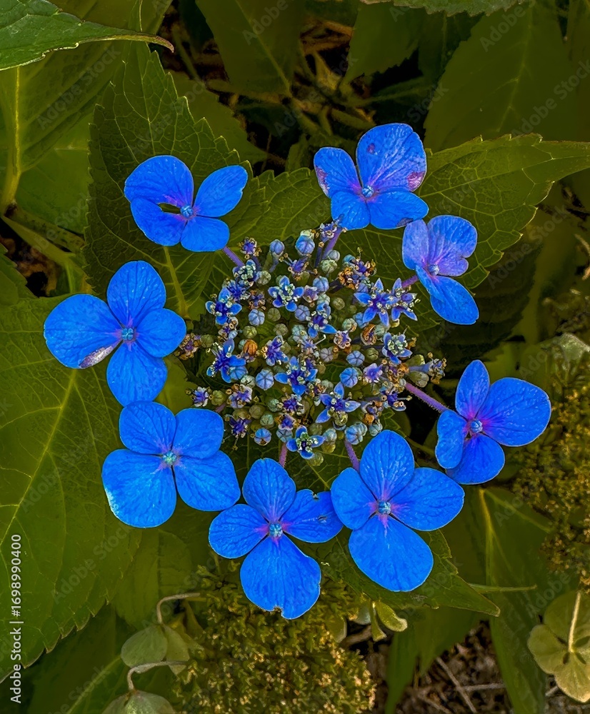 Close-up shot on a mountain hydrangea blooming among the green leaves