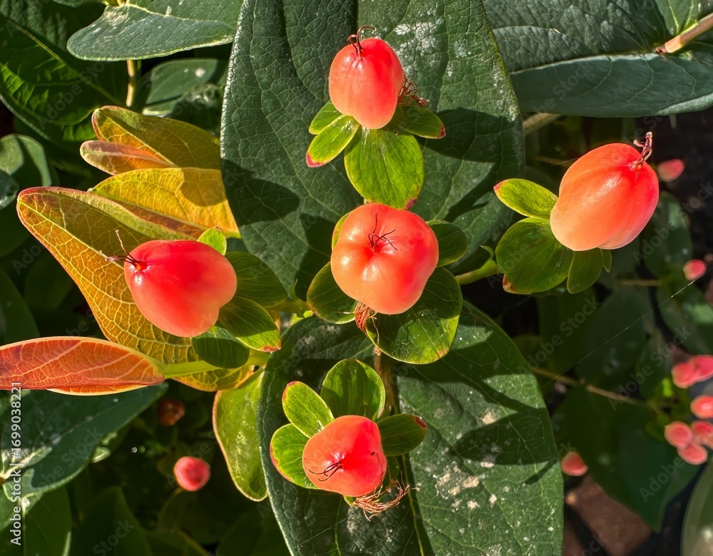 Tall Tutsan or St Johns Wort with red berries. Yellow flowers will be blooming soon