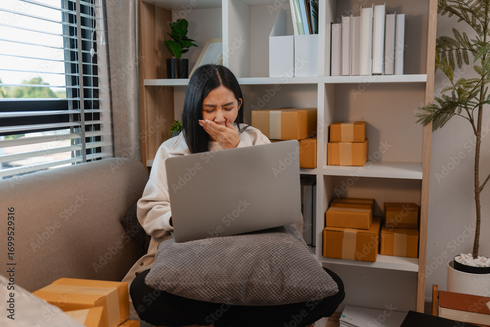 this businesswoman own a small business, sme, she is working in online business to sell her product, a lot of parcel, package, an entrepreneur is working on the parcel before deliver to customer