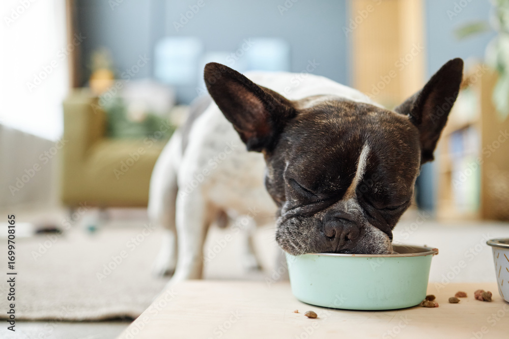 French Bulldog eating from metal bowl on floor, head lowered with eyes closed, indoor home setting visible in background, focus on dogs face and food bowl, close up perspective