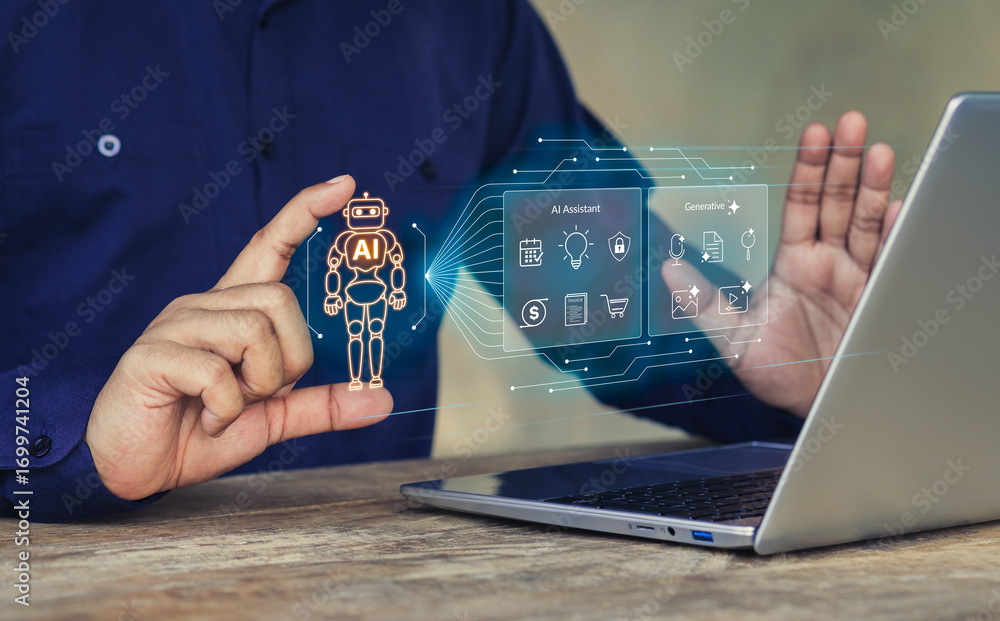 AI agent, holographic robot assistant concept, digital interface showing generative AI functions for digital business productivity, AI agent work with holographic robot interface and assistant tools