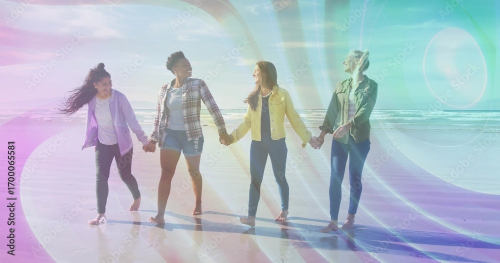 Walking four friends in jackets holding hands along beach at low tide, with sunlight lens flare