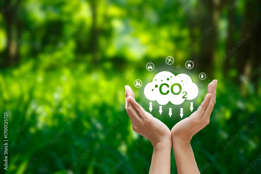 carbon footprint and Reducing CO2 Emissions, Promoting Sustainability Concept. hand holds CO2 cloud icon with Destroy the environment symbols, Oil use, cars, industrial plants.