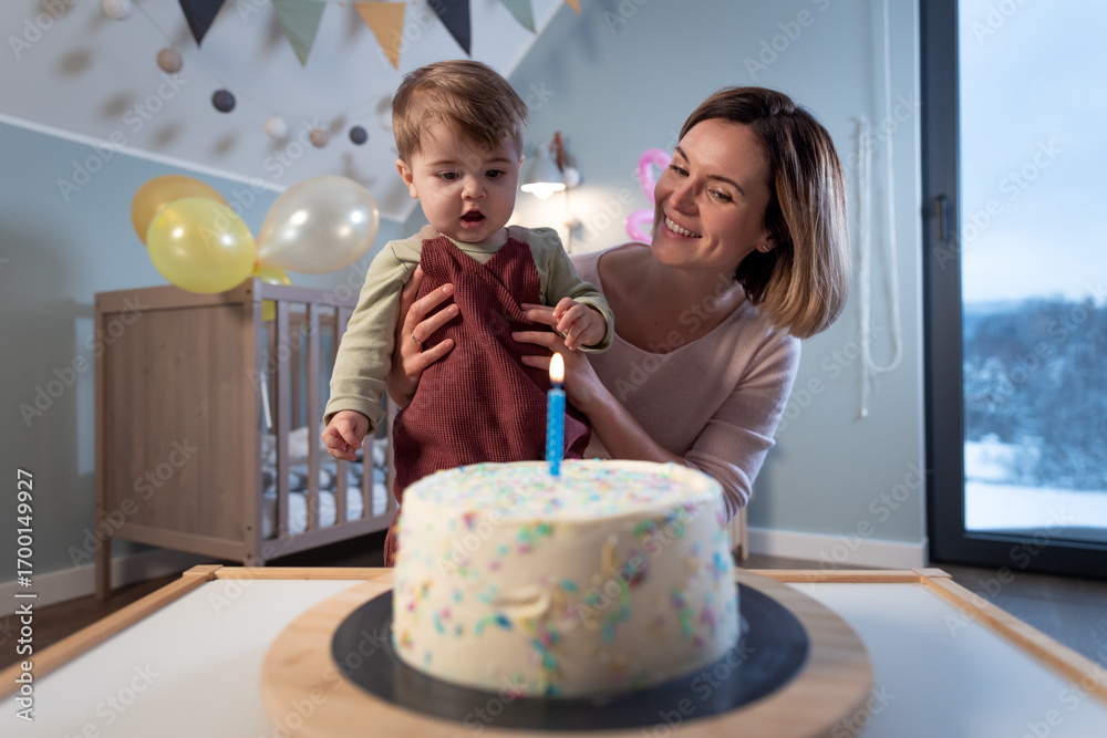 First birthday and birthday cake, child trying to blow out the candle on the cake