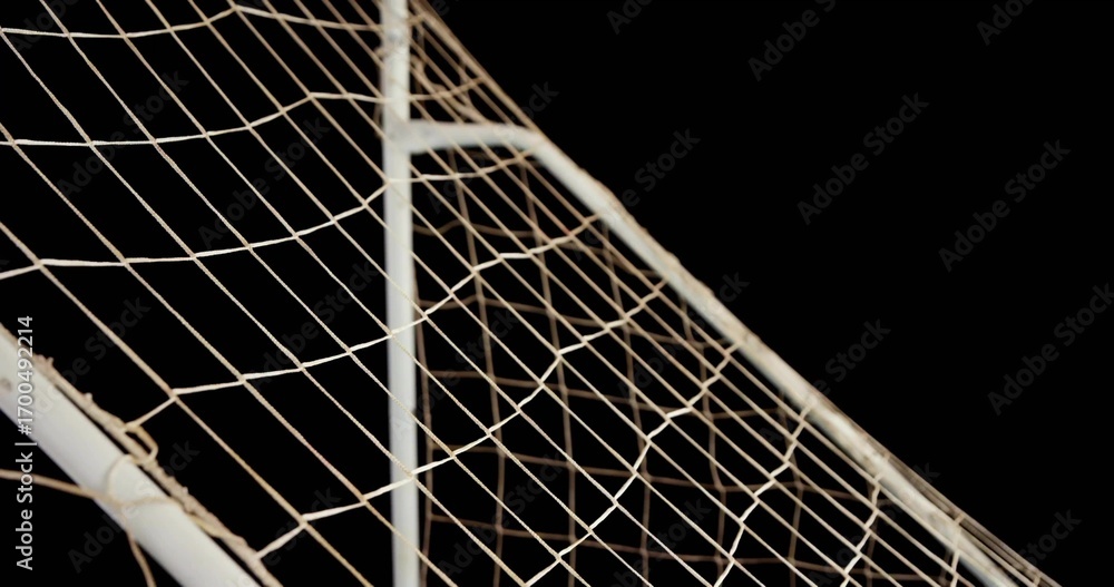 Displaying soccer goal corner with metal posts supporting diamond netting against black background