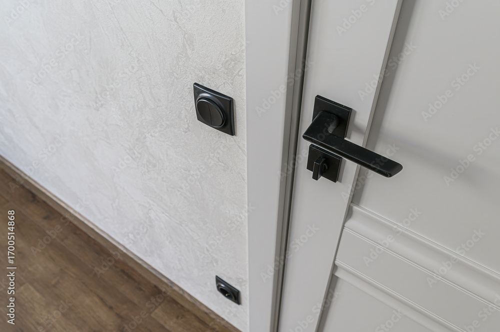 close-up of a gray door with a matte black handle, textured white wall with a black light switch, and wood flooring