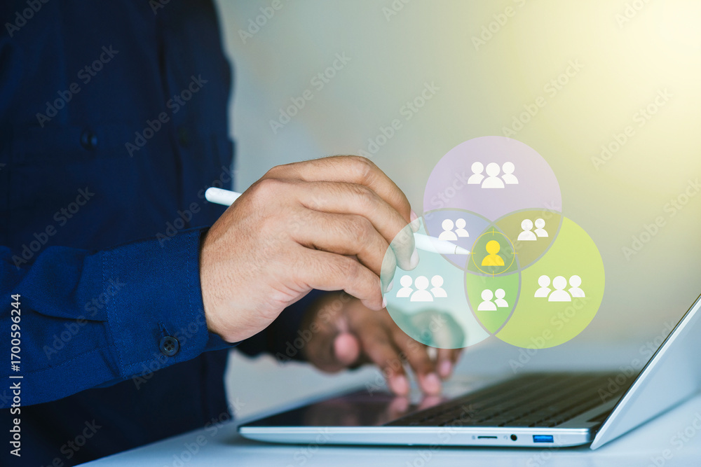 Niche marketing and personalization concept. Marketing segmentation strategy and consumer analysis. Marketer using laptop with venn diagram to analyze target customer data. selecting audience insights