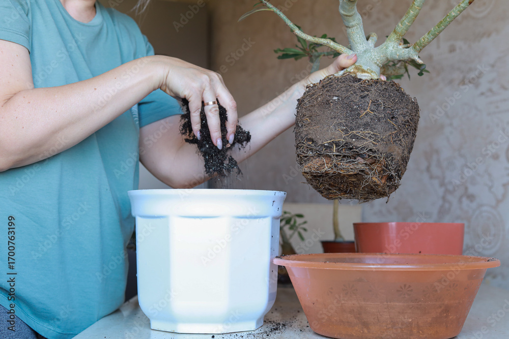 Hands holding adenium root ball and adding fresh soil into a new white pot. Home gardening care with copy space.