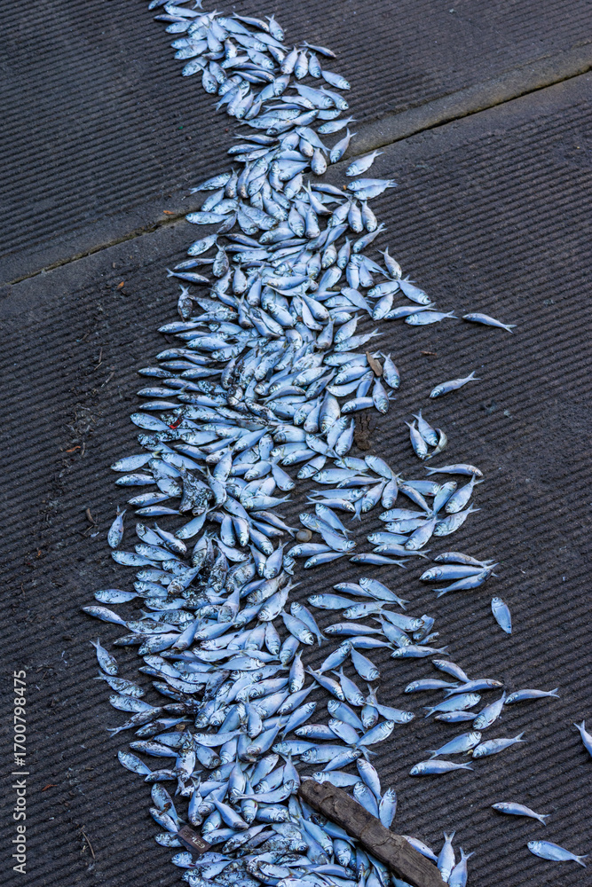 Dead fish in the harbor along the Patapsco River in Baltimore Maryland USA