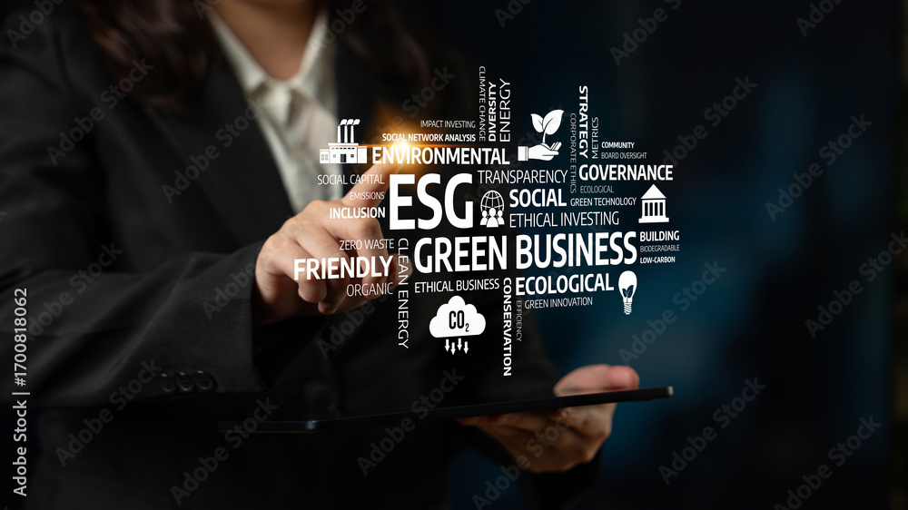 A professional using digital technology to showcase ESG principles focusing on sustainability and ethical business practices for future development and investment. Tessel