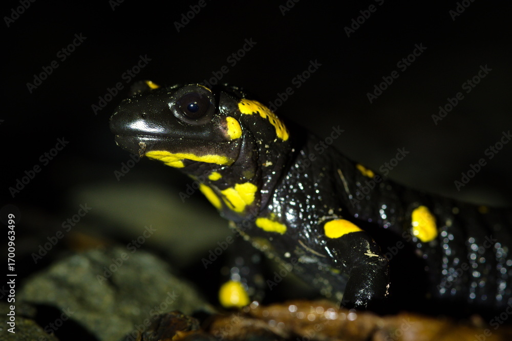 Fire salamander (Salamandra salamandra) portrait at night, Czech Republic.