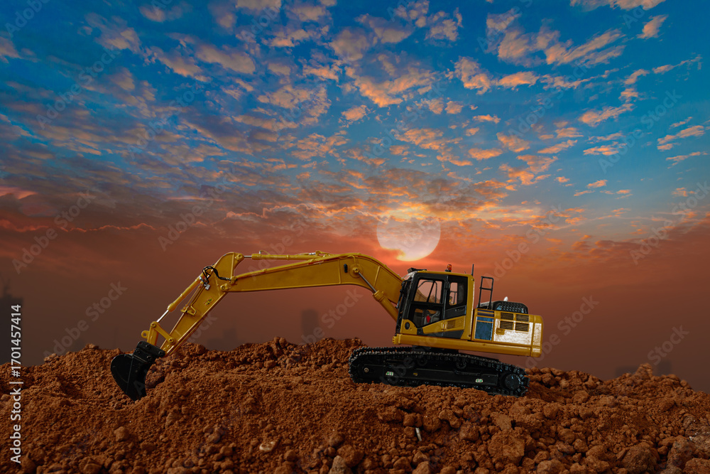 Crawler excavator with are digging the soil in the construction site with blue sky ,on the last light sunset background.