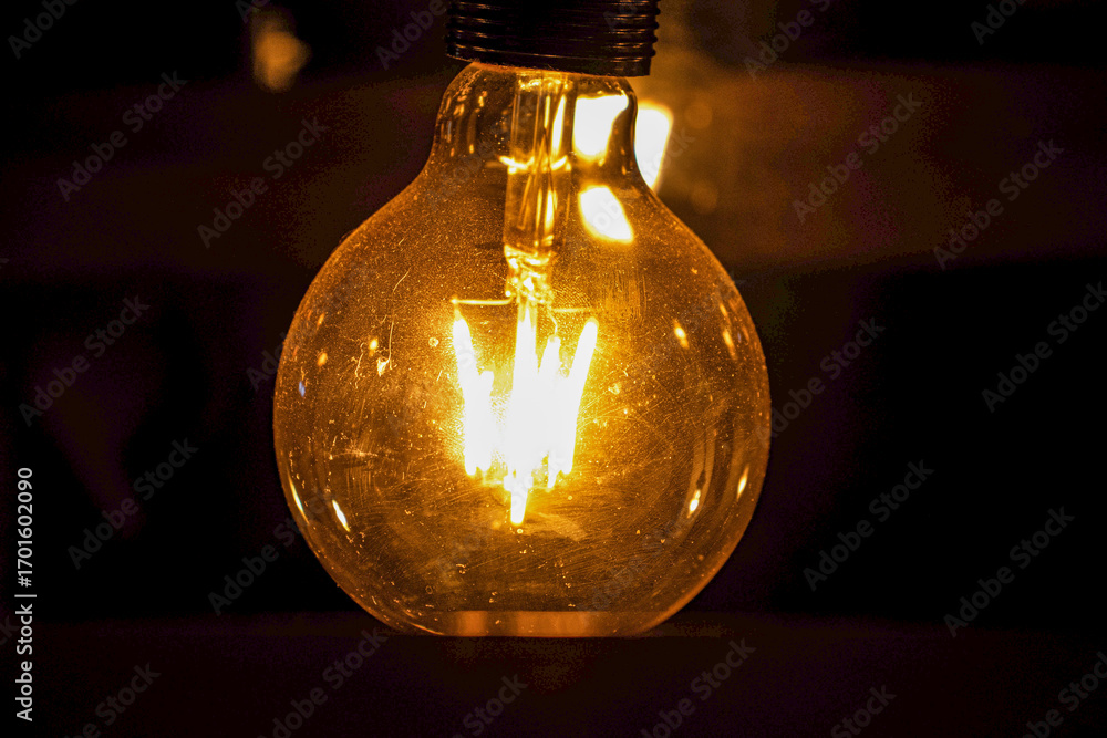 A vintage Edison style light bulb glows with a warm, yellow filament against a dark, moody background. The glass bulb has a rounded, classic shape, symbolizing idea or innovation.