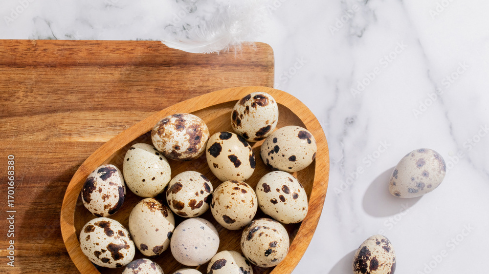 Quail eggs in rustic wooden bowl evoke speckled mysteries of Orion, culinary intrigue for Samhain feasts, miniature galaxies