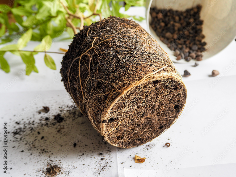 Transplanting of seasonal plants. Healthy plant roots. Transplant the pomegranate.
