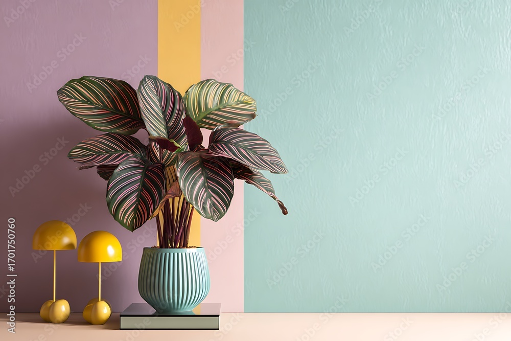 A vibrant calathea plant with bold patterned leaves on a sleek glass side table, pastel toned wall behind with modern lamps