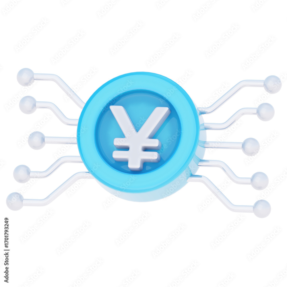 A 3D render of a digital Yen currency symbol connected to a circuit board, representing digital finance and technology.