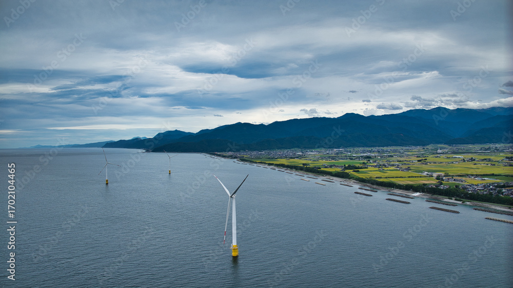 雨が降りそうな9月の富山県入善町沿岸からみる洋上風力発電風車をはじめとする様々なもの