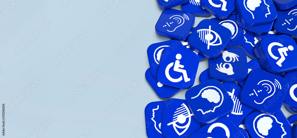Inclusivity Signage: An artistic display of blue icons symbolizing inclusivity, accessibility, and the promotion of human rights, reflecting a commitment to diversity.