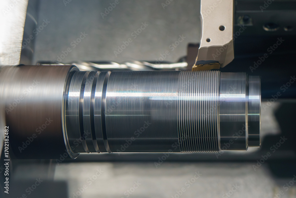 Close up scene the CNC lathe machine groove cutting the metal shaft parts.