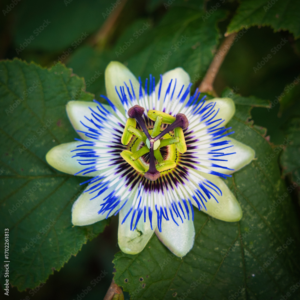Surreal photo of a vibrant passion flower (Passiflora) with blue-white filaments, radial symmetry, and lush green details. Ideal for botanical and fantasy themes.