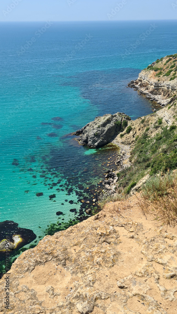 A scenic coastal view with clear turquoise waters and rocky cliffs. The landscape offers ample copy space for text or graphics, ideal for travel or nature concepts.