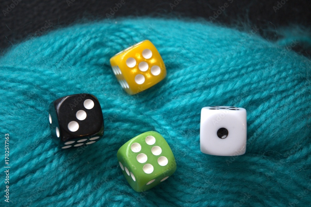 Brightly colored dice resting on a green yarn ball, close-up with copy space. Symbol of life’s thread, chance, fate, and free will.