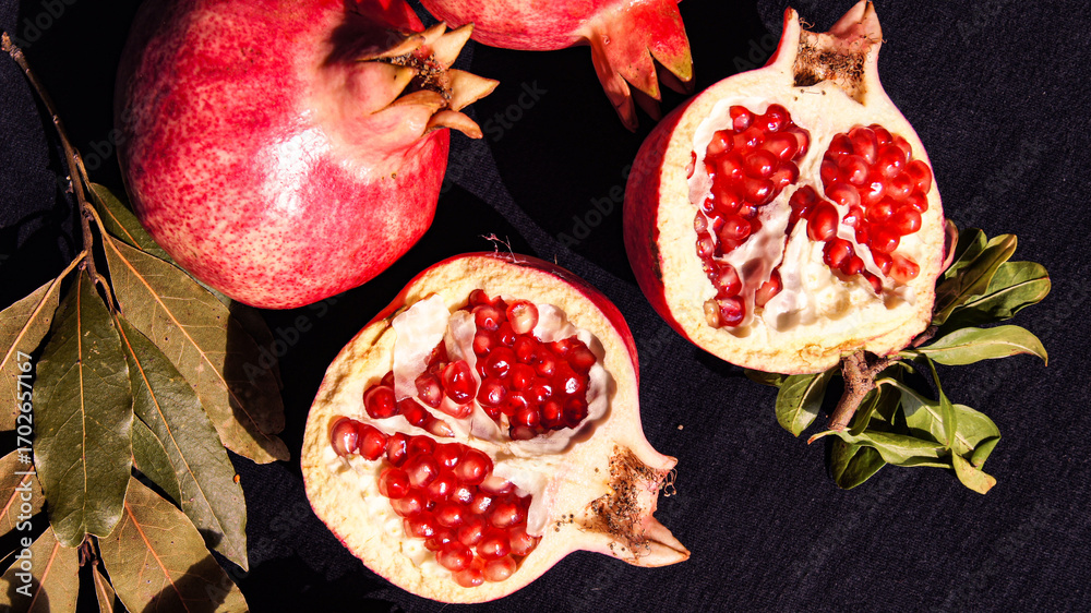 Fresh pomegranates on black background, dramatic contrast food photography, vibrant red organic fruit, antioxidant rich superfood, minimal still life, healthy vegan diet concept.