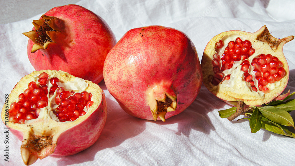 Close-up of fresh pomegranate fruit, macro texture of red peel and juicy surface, natural light photography, organic superfood rich in vitamins, healthy lifestyle and diet background image.