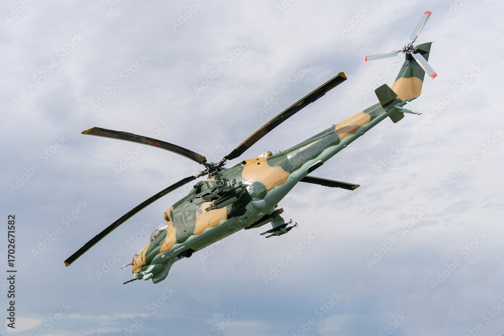 Camouflaged Soviet Mi-24 military attack helicopter in low flight