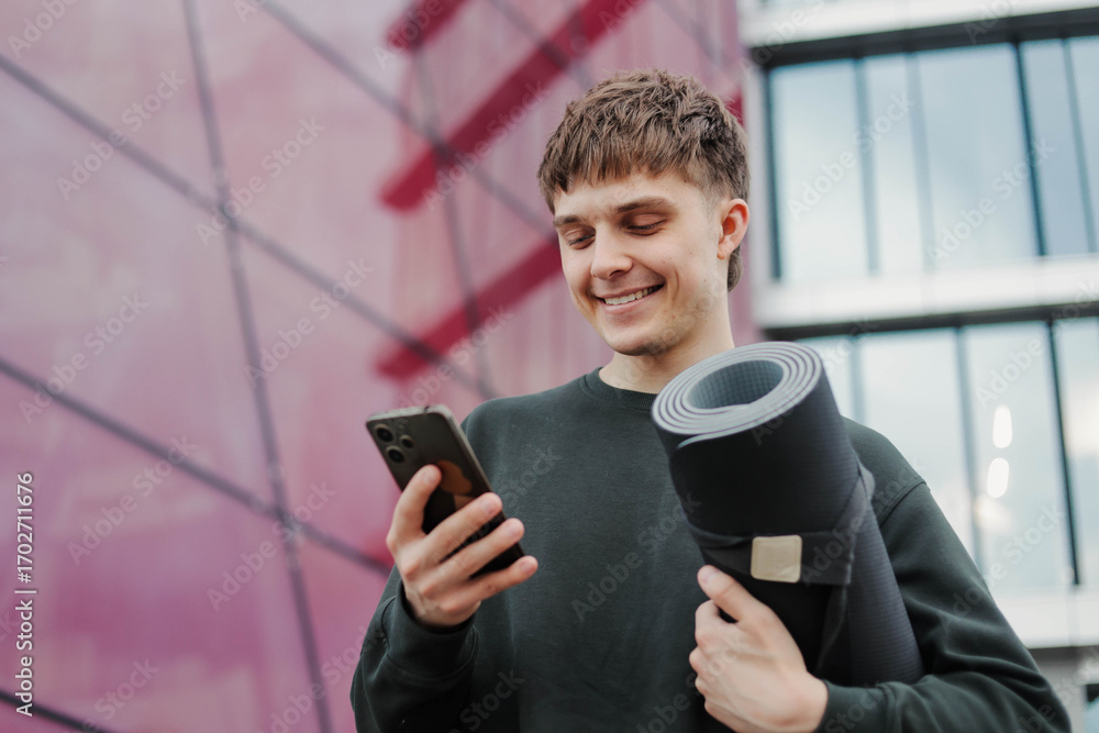 Portrait of young athlete holding fitness mat and phone, browsing online app for yoga.