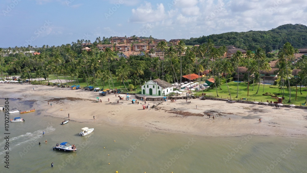 Wonderful aerial view of Praia dos Carneiros beach with stunning landscape with sand banks, palm trees, boats and turquoise waters near Recife, Pernambuco State, Brazil