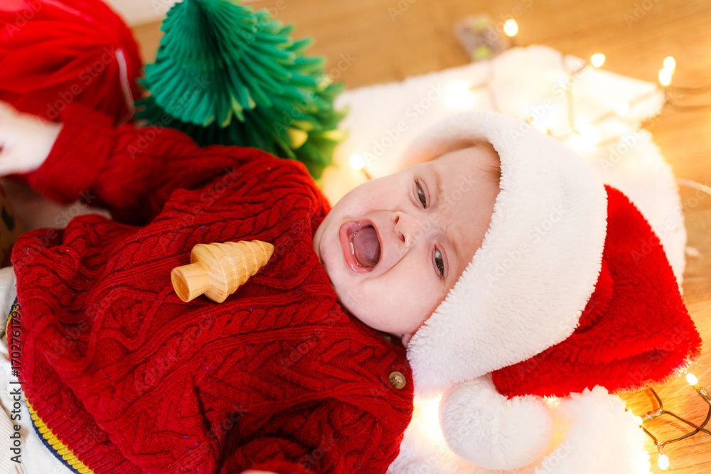 Adorable baby boy in santa hat and with wooden toy crying while lying under festive christmas tree and lights. Sad infant overwhelmed, too emotional holidays.