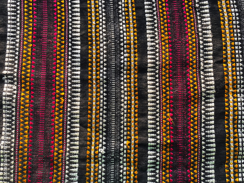 Black fabric featuring intricate, multi-colored woven geometric vertical lines, creating a striking textured pattern.