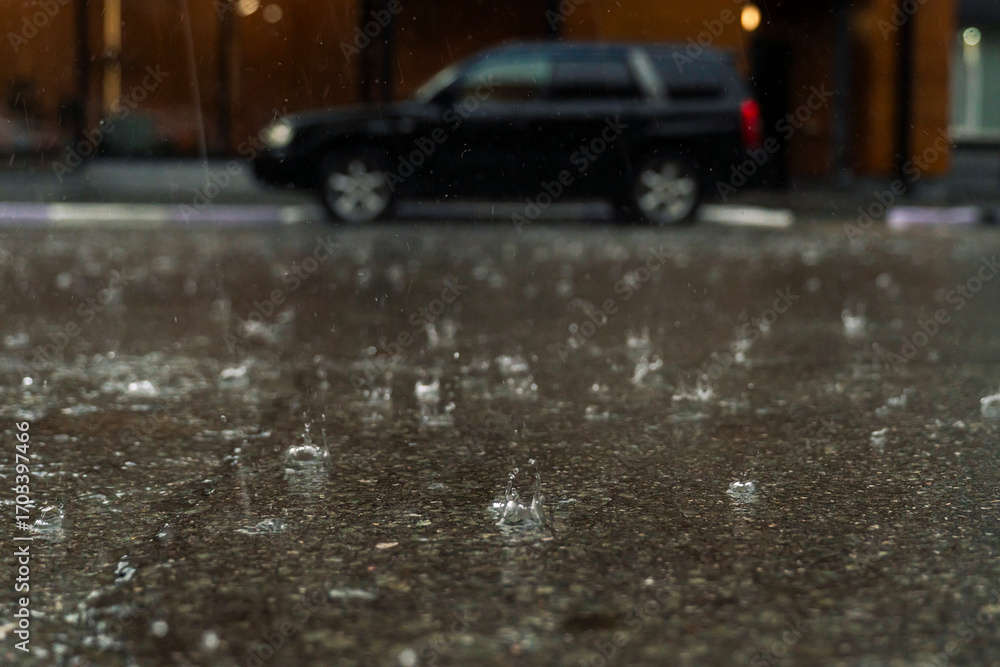 rain in the city, the flow of water along the city street during a downpour, bubbles, drops and splashes during rain