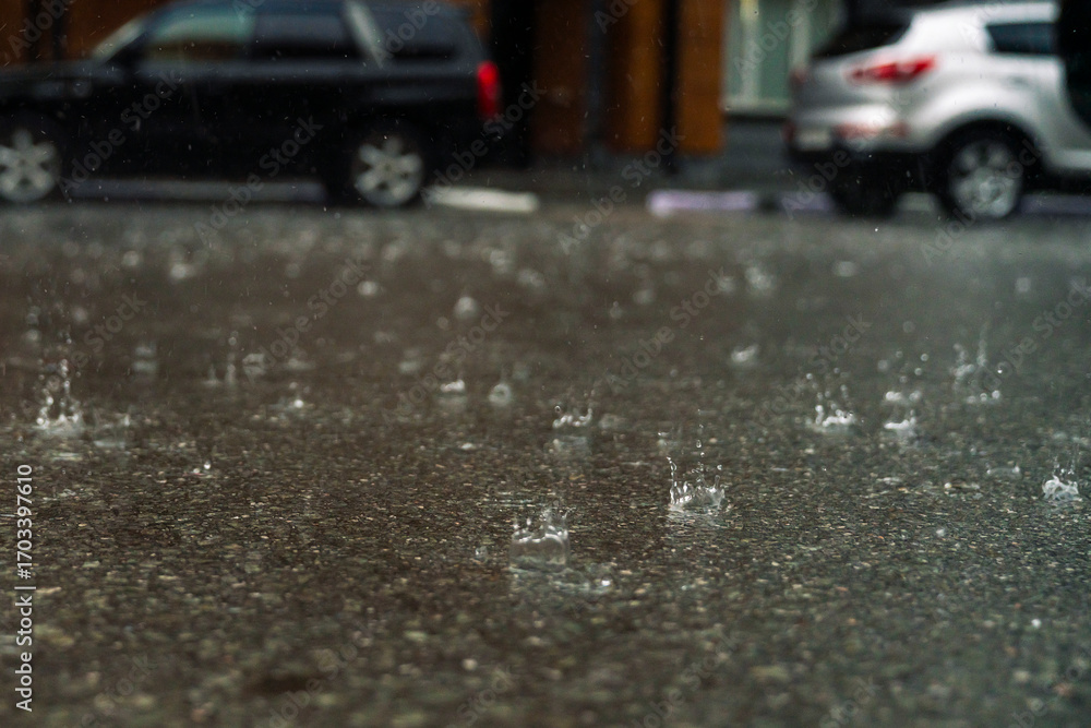rain in the city, the flow of water along the city street during a downpour, bubbles, drops and splashes during rain