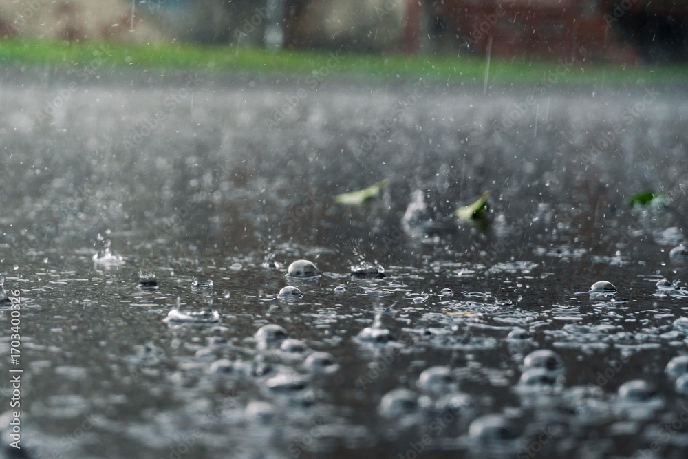 rain in the city, the flow of water along the city street during a downpour, bubbles, drops and splashes during rain