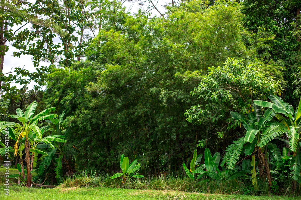 Close-up of natural background of various trees on high mountains and mist spreading throughout the trees as rain falls on the way.