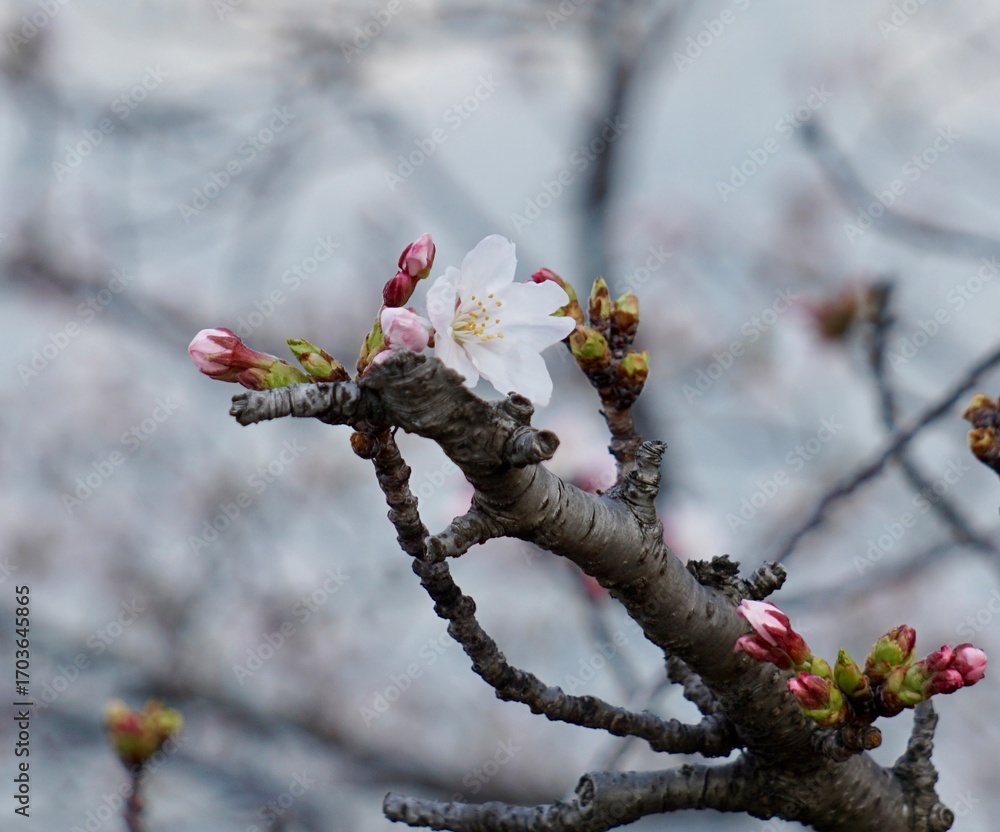 Closeup macro shot of single pink cherry blossom bloom on a branch